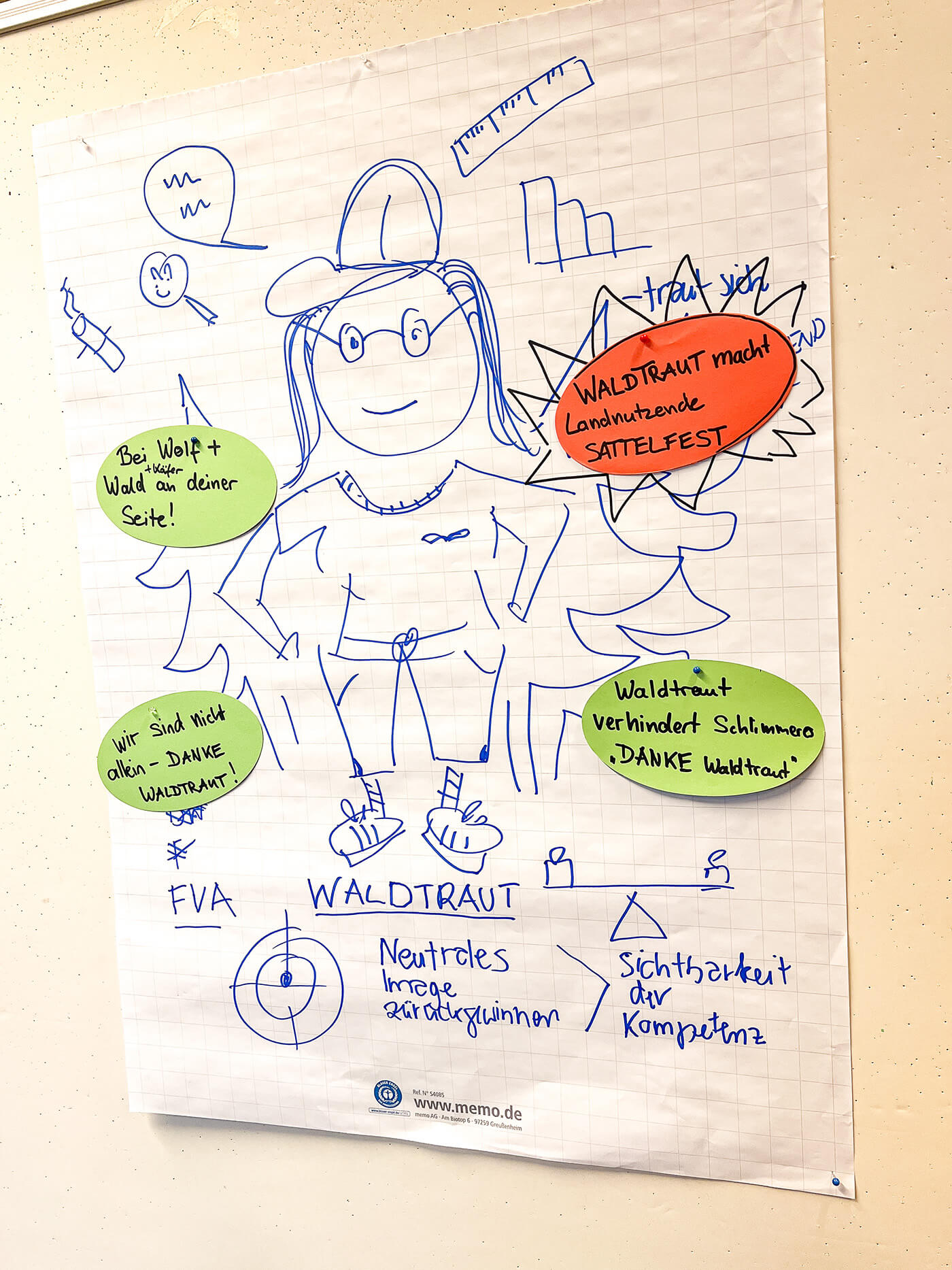 Das hörte Frau Wolf, während sich die Teilnehmenden um das Flipchart-Scribble von Waldtraut drängten. In nur einer Stunde entstand am Workshop der Veranstaltung „Forst trifft Medienprofis“ eine fiktive Marke – wir tauften sie Waldtraut.
